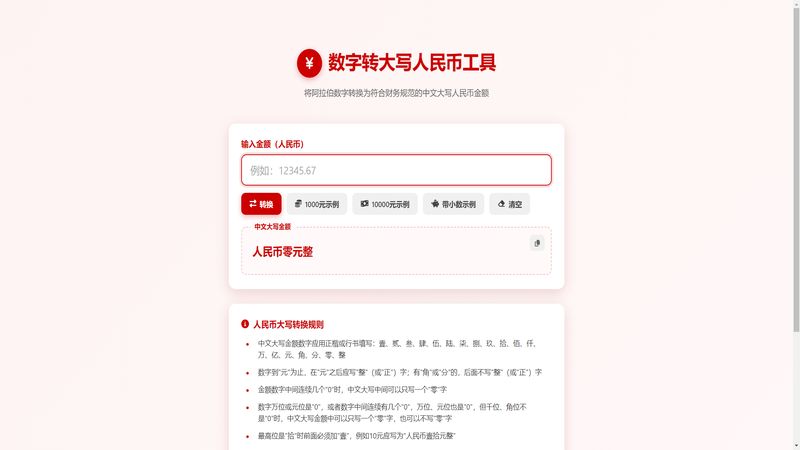 免费在线人民币大写转换工具,支持阿拉伯数字快速转符合财务规范的中文大写金额,自动处理元角分、零数规则,适用于会计记账、票据填写、合同备案,操作简单无需下载!