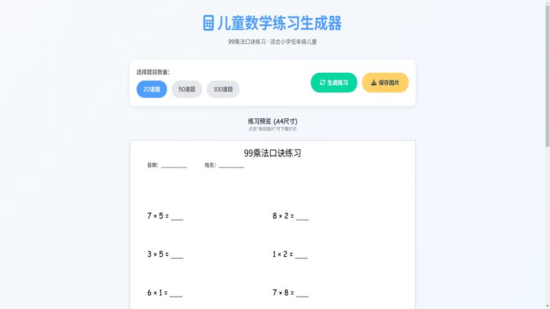 儿童数学练习生成器 99乘法口诀练习 · 适合小学低年级儿童