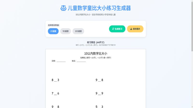 儿童数学童比大小练习生成器 10以内数字比大小 · 适合学龄前和小学低年级儿童