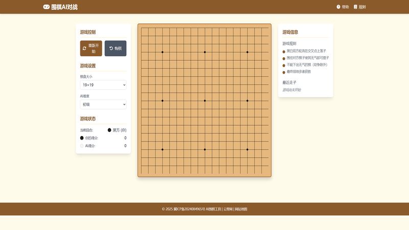 在线围棋 AI 对战游戏支持 19×19 棋盘多难度选择,玩家执黑 vsAI 对战记录得分,遵循围棋规则免费无下载即玩适合休闲娱乐。