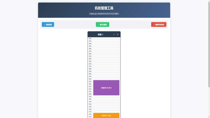 在线机柜管理工具支持 42U/36U/24U 等多规格机柜,可视化设计布局,添加路由器交换机服务器等设备,自定义颜色 / U 数,一键导出图片适用于 IDC 机房管理。