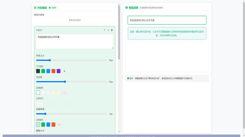 公众号排版工具支持在线自定义文章样式:调整字体、颜色、边框、圆角、内边距、对齐方式等,所见即所得,编辑完成后一键复制带样式的HTML,直接粘贴到微信公众号后台,无需代码基础。