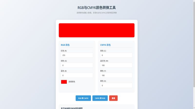 云帮网RGB与CMYK颜色转换工具:输入RGB值(0-255)或选择颜色,实时转换为CMYK(0-100%),附带转换公式说明与颜色范围解析,助设计师精准匹配屏幕显示与印刷输出。