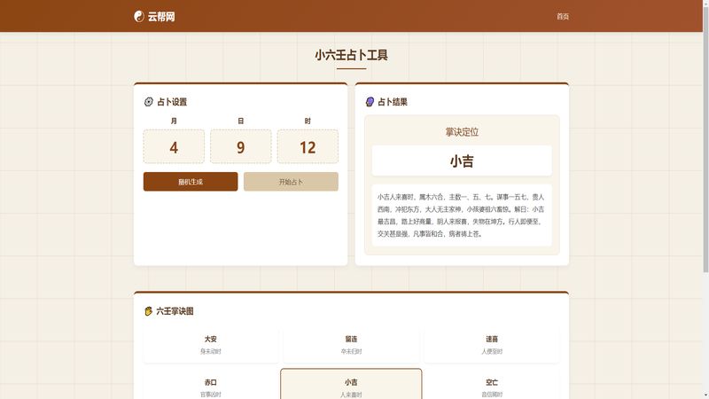 云帮网小六壬占卜工具提供在线免费占卜服务:通过报时起课法解析大安、留连、速喜、赤口、小吉、空亡六种状态,附带解签与吉凶提示,无需注册,即点即用,传承千年玄学智慧。