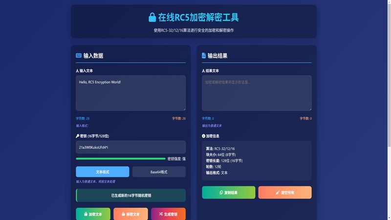 在线 RC5 加密解密工具采用 RC5-32/12/16 算法 128 位密钥 12 轮加密,支持 Base64 格式输入输出,对称密钥块加密安全抗攻击,一键完成加密解密操作。