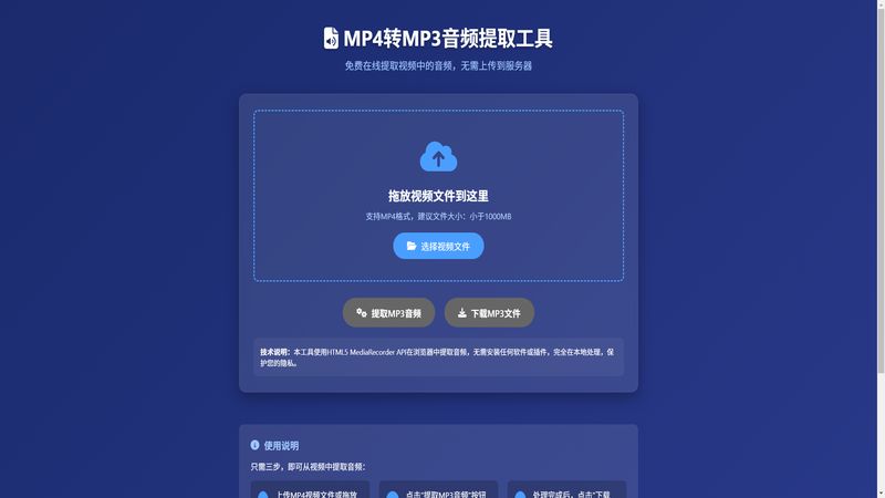 在线 MP4 转 MP3 音频提取工具免费使用,支持拖放 / 上传 MP4 文件 (1000MB 内),无需上传服务器本地处理,三步提取下载 MP3 音频。