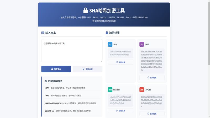 SHA 哈希加密工具支持 SHA1/SHA3/SHA224/SHA256/SHA384/SHA512/RIPEMD160 多种算法,输入文本即获对应哈希值,适用于数据完整性校验、比特币地址生成等场景,高效精准的哈希加密工具