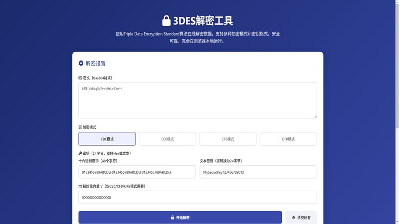 3DES 解密工具采用 TripleDataEncryptionStandard 算法支持 Base64 格式密文在线解密本地运行安全可靠无需上传数据支持 CBC/OFB/CFB/ECB 加密模式输入 24 字节 Hex / 文本密钥及对应 IV 即可完成解密