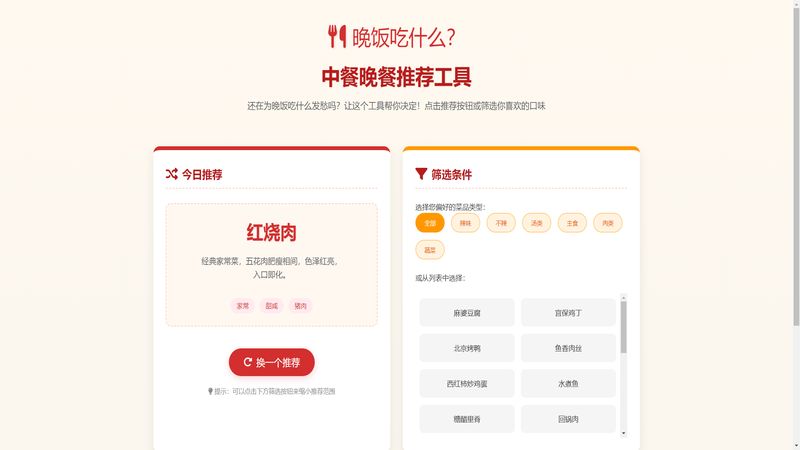 中餐晚餐推荐工具帮你解决晚饭吃什么的困扰,可推荐麻婆豆腐等川菜辣下饭菜品,支持口味筛选,点击即可获取美味中餐晚餐推荐,轻松确定每日晚餐菜品,满足下饭需求。