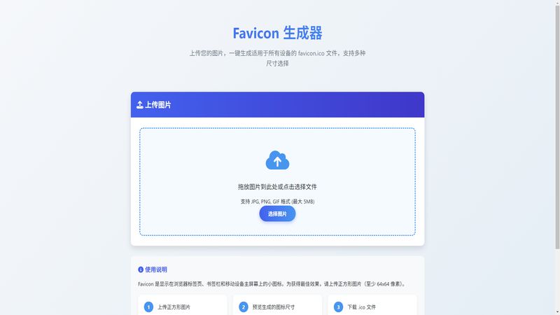 上传您的图片,一键生成适用于所有设备的 favicon.ico 文件,支持多种尺寸选择