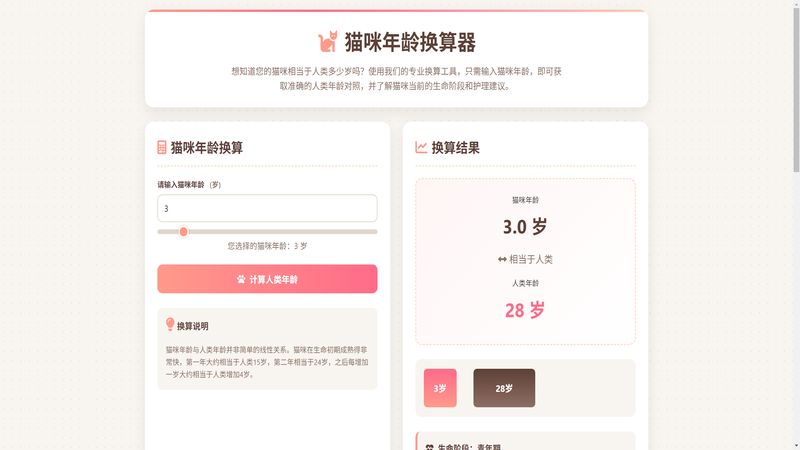 猫咪年龄换算器输入猫咪年龄即可获取准确人类年龄对照划分幼猫青年猫成年猫老年猫等生命阶段提供对应护理建议助力科学养宠