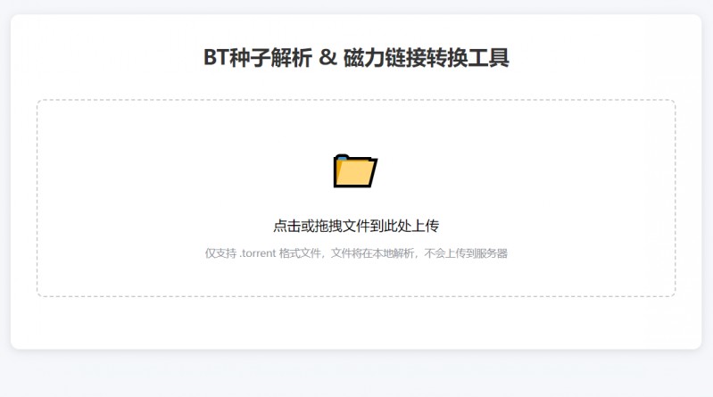 BT 种子解析磁力链接转换工具支持 torrent 格式文件上传,全程本地解析不将文件上传至服务器,可精准解析种子名称大小等详细信息,实现种子转磁力链接,支持磁力链接一键复制,安全私密。