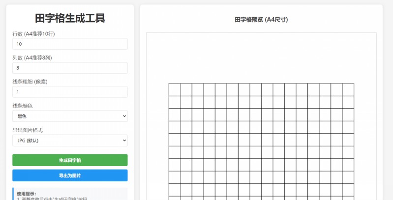 田字格生成工具支持自定义行数行列线条粗细颜色,生成标准 A4 尺寸田字格,可导出 JPG/PNG 格式图片,PNG 无损透明,适配儿童练字、教学打印等场景,在线操作便捷高效。