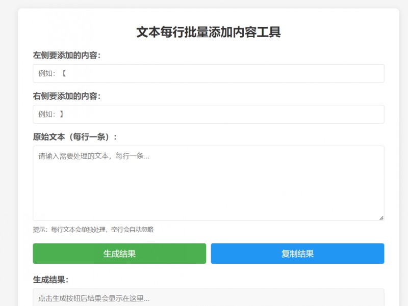 文本每行批量添加内容工具支持左侧右侧自定义添加内容,原始文本按行处理自动忽略空行,生成结果可一键复制,在线高效完成文本行批量编辑处理,无需下载安装。
