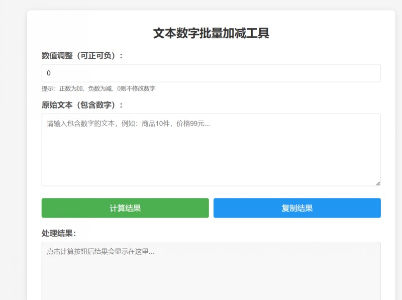 文本数字批量加减工具支持自定义正负数值调整,可对文本内数字进行批量加、减操作,0 则不修改数字,处理结果可一键复制,在线操作高效便捷无需下载。