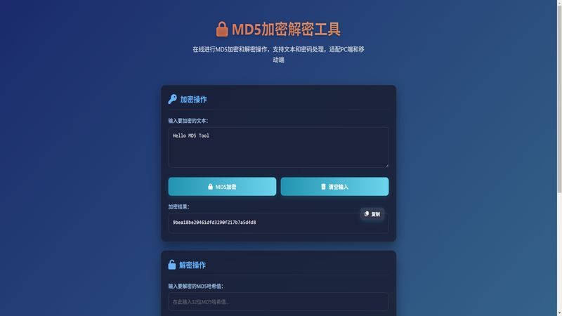 在线进行MD5加密和解密操作,支持文本和密码处理,适配PC端和移动端