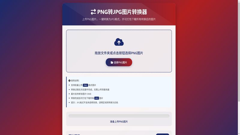 上传PNG图片,一键转换为JPG格式,并可打包下载所有转换后的图片