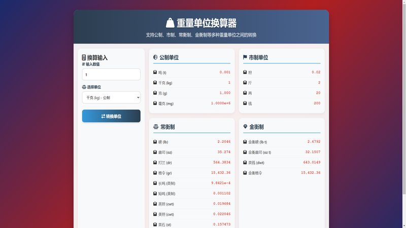 支持公制、市制、常衡制、金衡制等多种重量单位之间的转换