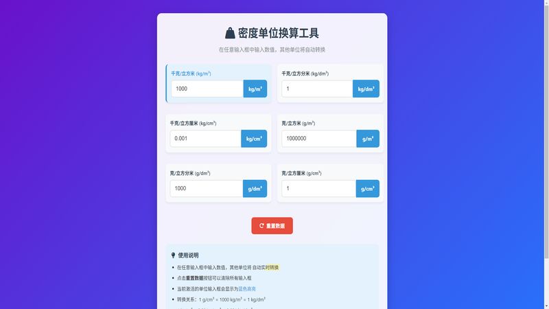 密度单位换算在线工具在任意输入框中输入数值,其他单位将自动转换