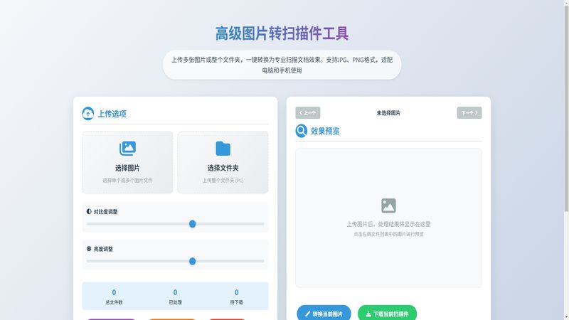 上传多张图片或整个文件夹,一键转换为专业扫描文档效果。支持JPG、PNG格式,适配电脑和手机使用
