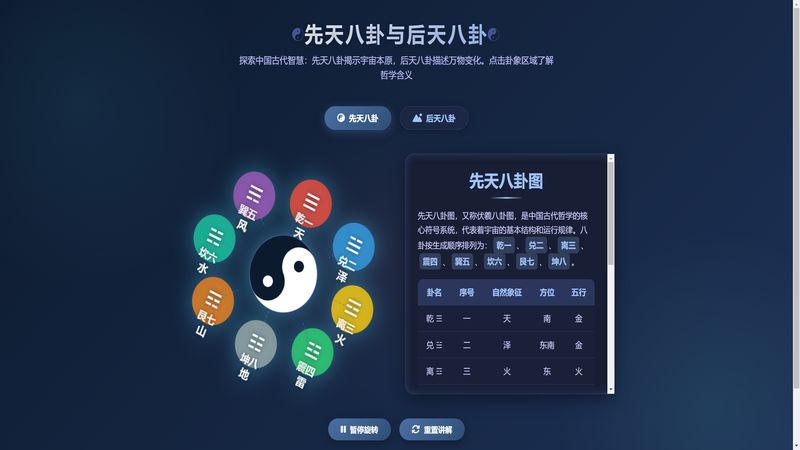 探索中国古代智慧:先天八卦揭示宇宙本原,后天八卦描述万物变化。点击卦象区域了解哲学含义