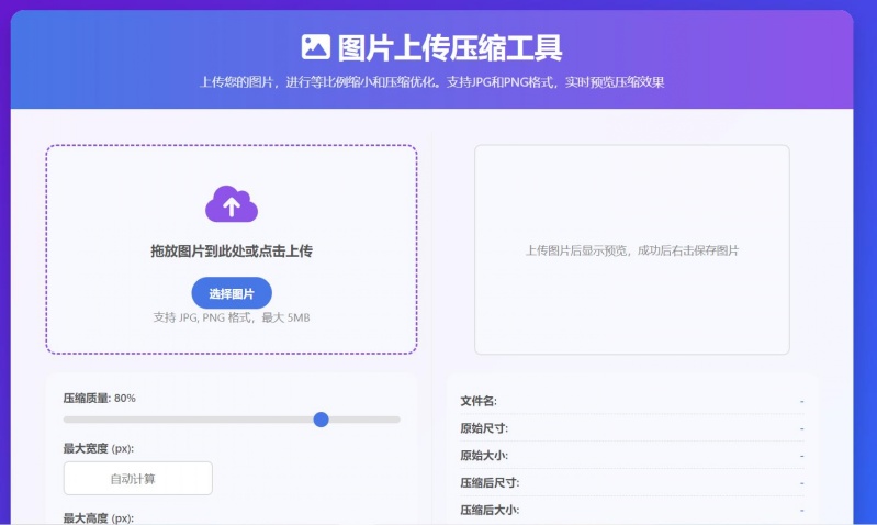 上传您的图片,进行等比例缩小和压缩优化。支持JPG和PNG格式,实时预览压缩效果